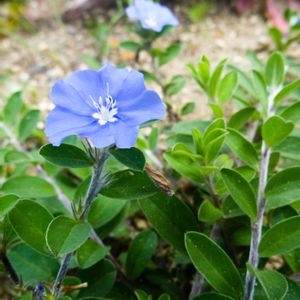 エボルブルス(アメリカンブルー)の花 訪問先の駅前広場の花壇でひときわ青い花を見ました。エボルブルスと言うアサガオ科のお花だそうです。