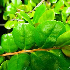 訪問先の駅前の植え込みのイヌツゲなのか?それにしては葉が大きい気がします。 ここの植え込みも近いときに刈り込みされたのでしょうか?ところどころ,綺麗な新緑が伸びています。葉っぱが大きい事、実が枝の中頃に付くなどの特徴を再度見に行ってハマヒサカキとしました。
