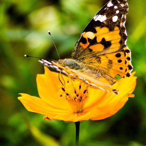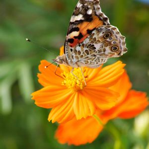 キバナコスモスを訪れたヒメアカタテハ オレンジ色の花に,さっと,オレンジ色の蝶が飛来しました。 ヒメアカタテハです。自然の模様は美しいです。