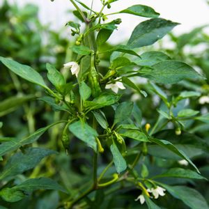 街角GS歩きで見かけたシシトウの花と実 あるお家のガレージの入り口の植え込みに白い花と緑の実を付けたシシトウが植わっていました。花と実,とツボミの様なものも写って居ますが,それぞれどうして形が変わっていくのかはちょっと不思議に思いました。