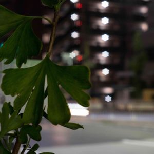 街路樹のイチョウをすかして見るマンションの灯 庄内川を渡って町歩きスナップの終着点東枇杷島に到着,日没からしばらく経って,街の灯が賑やかに光り出しました。