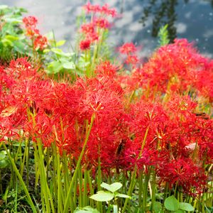 津市美濃屋川のヒガンバナ 真っ赤な花が咲きそろいました。水面には鱗雲も見えて,秋が来たことを実感します。