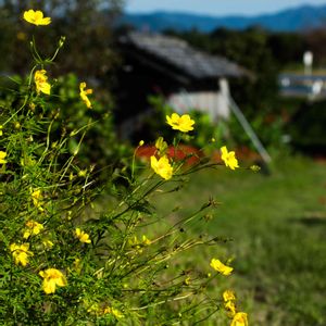 畑の脇に咲くキバナコスモス 津市安濃町一帯は,田んぼや畑が広がり,綺麗にお花も植えられています,GSするには絶好の場所。ここのキバナコスモスは,オレンジというより大変綺麗な黄色でした。遠くにヒガンバナが見えます。