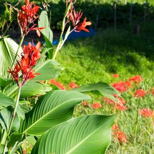 安濃の畑のそばのカンナとヒガンバナ カンナの花の盛りもそろそろ終わりかもしれませんが,ここではまだ綺麗な花を咲かせていました。大きな葉っぱの模様が綺麗です。遠くにヒガンバナもあって,赤に赤の取り合わせです。