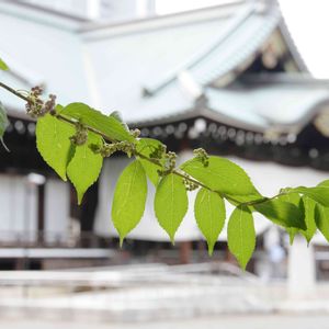 ムラサキシキブと靖国神社ご本殿 八月末の東京はすこし曇り,夏にお参りできて良かったです。