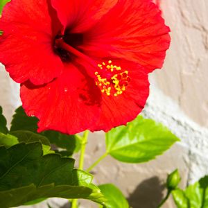 久屋大通公園フラリエの入り口を飾るタイタンビスカス やっと9:00の開園時間です。入り口を入ると,とっても大きな深紅のハイビスカスが出迎えてくれました。立派!直径20cmはあったと思います。