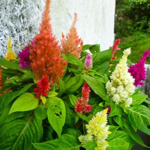 ケイトウの寄せ植えが色とりどりでナイス スペイン村のヨーロッパの街角風の壁にいろいろな花が寄せ植えされていてとても綺麗(センスが良い)だと思いました。