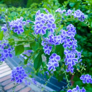 青く美しく咲くデュランタの花 パルケエスパーニャのヨーロッパの田舎風の町並みはお花で一杯でした。この花は初めて知りました。原産はアメリカから南米とのことです。