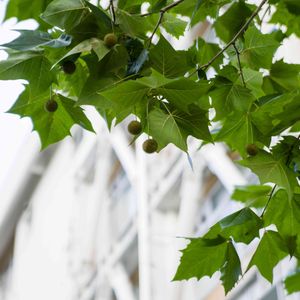 プラタナスの実 台風の風で落ちた実も多くありましたが,ちゃんと残って育っている実ももちろんあります。白い校舎をバックに入れて,ちょっと涼しい,雰囲気だけ,ですが。