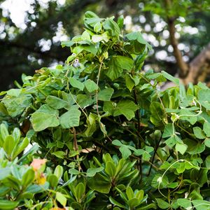 校庭のトベラの植え込みの上で繰り広げられるツタ植物異種間バトル トベラの植え込みに覆い被さるように,クスとヘクソカズラが戦いを繰り広げています。クズが押している様に見えますが,ここのクズの葉はやや小さく勝負はまだきまらない,のかも。