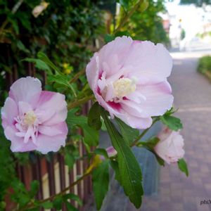 坂を登ると花が迎えてくれます。 八重咲きのムクゲの花が綺麗です。朝は早いですがすでに相当暑く,綺麗な花が迎えてくれるので,坂を登る足も軽くなります。