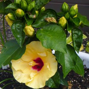 黄色いムクゲもあるんですね。訪問先の街は,全体がGSジェニックです。あるお宅の玄関先に鉢植えの黄色い花が咲いています。葉っぱの形から,ムクゲと思いますが,黄色いのもあるんですね。 miekoさんから、ハイビスカスではないかと教えて頂きました。ありがとうござます。一応迷って調べたつもりだったのですが、そう思って調べると、雌しべがチョット短いが、葉っぱは間違いない、ハイビスカスに訂正します。ありがとうござます。