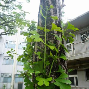 キャンパスのイチョウのひこばえ イチョウの葉に,こんなに深く切れ込みが入っていたのか? いままであまり意識していませんでした。調べるとひこばえの枝に付く葉に切れ込みが多い多片葉が多い傾向があると,観察を述べているWebページを見つけました。そうなんだ!