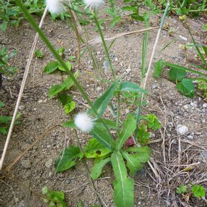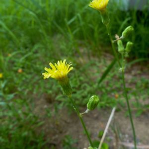 キャンパスで今年初めて見たキク科の花です。 ブタナ,とも思うのですが,難しくて難儀しております。皆様よろしく御指南お願いします。下に綿毛が写っています。ツボミがシシトウみたいで特徴的です。花は半開きのタンポポ状で,朝が早いからかもしれません。