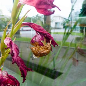 訪問先のキャンパスの植え込みで撮影。花の終わった赤い花びらにしがみつくようにアブラゼミの抜け殻が着いています。アブラゼミを今年初めて見ましたし,この萎えた花の細い花びらがまだ残った一瞬を通じて虫の新しい命が羽ばたいたと思うと感無量です。お花の名前が分からず。皆様もしおわかりでしたら,教えてください。幸い,植物全体がガラスウインドウに写って居ます。