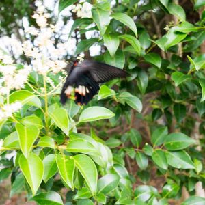 ネズミモチの花を訪れたナガサキアゲハのメス 駐車場の隅のネズミモチの木を毎日見ます。花が散って道路が白く染まっています。ナガサキアゲハのメスが,さっと,飛来しました。慌ててシャッターを切ったので,ぶれてるし,花もいまいちですが,メスの上の羽の根元の赤い印が綺麗なので,本人としては気に入っております。いかがでしょうか?
