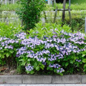 アジサイ歩道! 歩道の向こう岸,あじさいたちが皆こちらを向いています。 思いもよらず何となく撮った写真がとっても気に入りました。