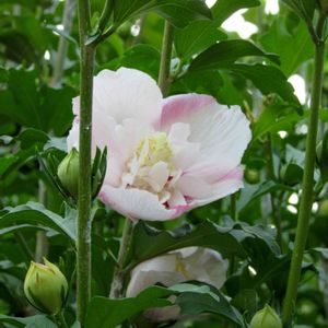 タチアオイの花 通りすがりの道ばたの植え込みに咲いていました。夏らしい印象を受ける花だと思いました。花びらのヘリがピンク色が濃くなっていて,涼しげでした。