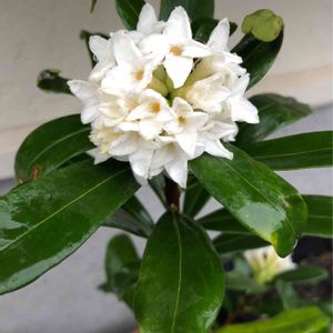 おはようございます😊 雨続きでテンション下がり気味ですが、昨年見切り品でお迎えした沈丁花(白花)が満開になりました💕 よく咲いてくれたね!☺️ 近くでクンクンするといい香り✨🌸