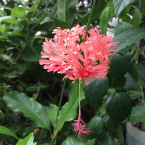 ちょっと変わった花姿のハイビスカス✨ 「フウリンブッソウゲ」と言い、 品種改良されたハイビスカスで、風鈴のような花姿からそう呼ばれ、別名コーラルハイビスカス✨ 風に揺られてとっても可愛い💕 垂れ下がった部分が無ければ、一見、曼珠沙華に似てるかな〜😊