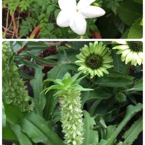 香りが大好きなジャスミン✨ そしてこの夏、こんなユニークな植物に一目惚れしちゃいました😍 見た目、何でもないグリーンの植物なんだけど、花の先端に帽子のような葉っぱ😳 まるでパイナップルみたいなユニークな姿に惹かれたぁ✨ 見た目の通り『パイナップルリリー』と呼ぶんだそうです🍍 学名『ユーコミス』別名『エウコミス』ギリシャ語で 『美しい頭の毛』という意味だそうで、何だか笑えた😁どことなく、トロピカルな気分を醸し出しくれるお花💕 夏のお庭を爽やかにしてくれていました✨
