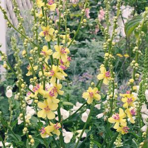 巨大宿根草の開花は個人的にバラより嬉しい❣️😆💨 バーバスカム シックスティーンキャンドルズが今朝からようやく咲いてきました〜😭 イエローの花弁にパープルの花芯が、可愛すぎる〜😍😍