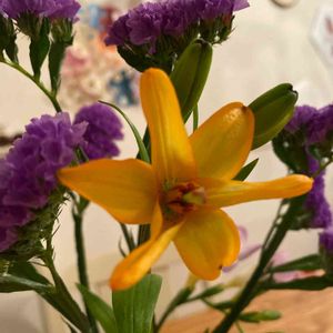 姫百合🌼 お花くんチョイス👦ピアノ🎹教室の帰りにお花屋さんでお花を買って帰ります♪毎週はお財布が厳しいので月に2回くらい🙏 今日は可愛いらしい姫百合とスターチスとガーベラを選んで満足そうでした👦