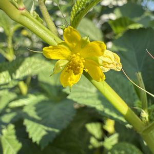 モロヘイヤにお花🌼が❗️ その後ちぎって食べました。頂いた苗🌱だったので、今年はプランターでもそこそこ大きく🌿なって重宝しました。