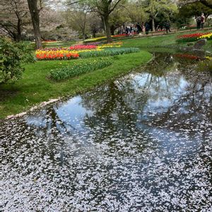 🌸花筏(ハナイカダ)🌸 桜が散って人が少なくなった公園へ 花筏を観に行って来ました。 人口池に浮かんだ花弁🌸