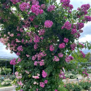 サイドから見たジャスミーナとペレニアルブルーのアーチとイーハトーブの香🌹 2025/5/31 平和のバラ園(万博記念公園)