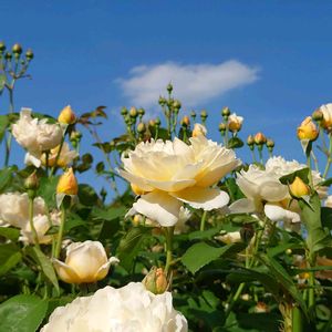 こんにちฅ՞•ﻌ•՞ฅワン♥☀️23℃ 【バージニア マッケッンナ】 2011年 イギリス ハークネス社 四季咲き シュラブ半横張 8㎝ クリームから白 バターカップイエロー 5、6年前京都の松尾園芸さんまで出向いて色、葉、香りに魅了🫣されて連れて帰りました🌹 そのころはまだまだ知識も無く、花壇の上で鉢ごと放置www 3年目くらいにほぼ枯れかけたけど、植え替え、土や剪定など見直して、今は風通しの良い木陰で機嫌良く長く咲いてくれています (´•̥ω•̥`)sᴏʀʀʏ 辺りがとても上品で優雅な香りが漂い、とても癒されます♡ 今年は今までで1番咲いてくれました🌹 アリ*:・(*-ω人)・:*ガト