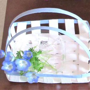むすめが育てているネモフィラをむすめが摘んでかざりました。 むすめが紙でつくったカゴに、ペットボトルの底を切り取ったものをうつわにしています。 梅雨のはじめにぴったりですねぇ~