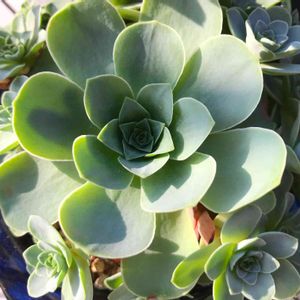 黒法師。いぶきの里より購入し、1年が経ちました。ただ今、葉の直径15センチ程。 今年の暖冬のお陰で冬型のアエオニウム達が生き生きしています。(念のため発泡スチロール管理) インフル息子まだ38℃近くあります。7日には小学校の体験入学なのに大丈夫か?!