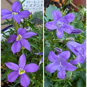 💜庭に咲くパープル系のお花たち💜🌼 ♡サワギキョウ(宿根ロベリア)♡画像の英字Lobelia sessilifoliaは学名 鉢植えで育てていたサワギキョウ水🚿をまいてる時にホースに引っかかって折ってしまいました😭 ①折れたサワギキョウ花瓶にさして開花!色が薄い紫になりました。 ②サワギキョウ残った鉢植え🪴の方も開花!花瓶の方と開花見比べると色が濃い紫。赤は開花待ち! ③ストケシア 2年め株が大きくなりました。 ④ヒメアガパンサス(トルテレイア) 2年め ⑤ローレンティアフィズアンドポップ(イソトマ)