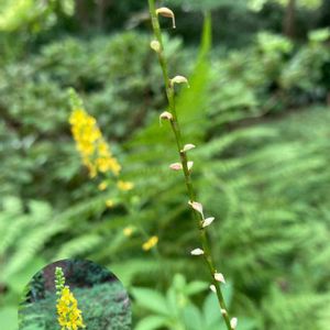 ミズヒキ 金と銀💛🤍 ギンミズヒキ(銀水引)を狙って撮ったら、、背後にキンミズヒキ(金水引)が♪ ギンミズヒキはミズヒキの白花種(タデ科) キンミズヒキは黄色の5弁花を上部にたくさんつけた穂状の花(バラ科) アカの他人でした➰ (ギン)ミズヒキの花は午前中の数時間だけ開く🌿(写真は閉じた状態です)