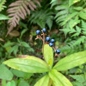 ヤブミョウガ(藪茗荷)の実 青みがかったツヤ感が綺麗です🔵✨ 四方に広がった葉っぱから、すーっと伸びた茎先についていて浮いているよう。。 葉っぱがミョウガに似ているからヤブミョウガ🌿 ミョウガの仲間ではありません🌱