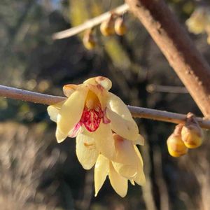 ワロウバイ(和蝋梅) 夕陽に照らされて✨ 花弁が細くて、花の中心が赤紫色をしているロウバイ です 下向きに咲いているので、花の中が撮りづらく…うーん。。と思っていたら、花弁が欠けている花が♪ 甘くいい香りです💛 ロウバイの基本種🌿中国原産🌿