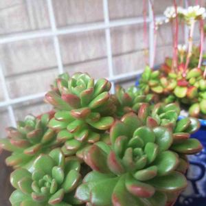 ジョイスツーロ✨ ツヤピカ✨ぷりぷりです💖 寄せ植えに使うかこのまま単独か… 後ろに写ってるのはお花の咲いた紅稚児です😊 100均に自転車🚲で行く予定が雨…止んでください…😢