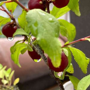 水やりは大変だけど 植物の変化に気づくチャンスがたくさんあります🎶 と言っても ちょっとシワになるくらいまで見過ごしていたニワウメ🔴 一粒食べてみたら「ジャムにできるかな🎶」って👍🏻 でも、種が大きくて果肉がちょっと(•ᴗ•; ) 鳥さんに食べていただきましょ〜