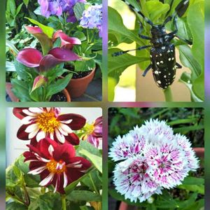 ☔雷雨の不安定な天気⚡ ピカッとしてるー! 今朝の庭の四コマ見てね! ✱頂いた紫陽花とカラーの苗を素焼きの鉢植えに! ✱カミキリさん出現! この子は退場願いました😅(ルリマツリの木) ✱おすまししてるコラレット咲きのダリア ✱かーわいい種まきのナデシコさん