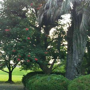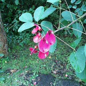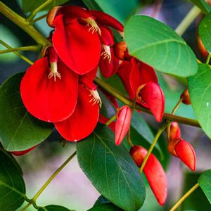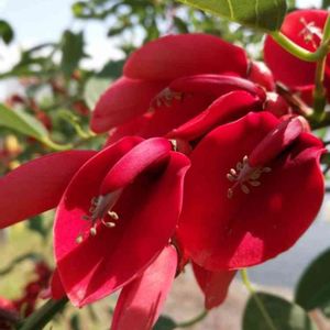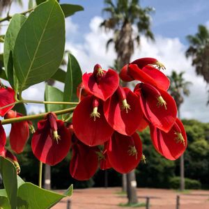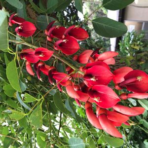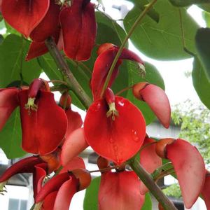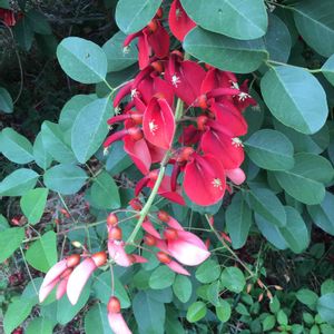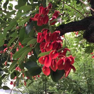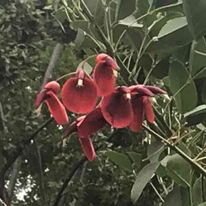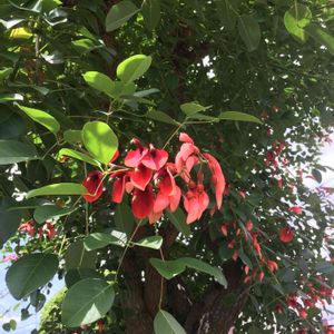 深紅の花が咲くアメリカデイゴ(亜米利加梯梧) 別名:マルバデイゴ。 マメ科の落葉低木です。 和名は「カイコウズ(海紅豆)」ですが、あまり使われませんね。 大きな木で…下に散った花を見つけると思わず上を見上げます。