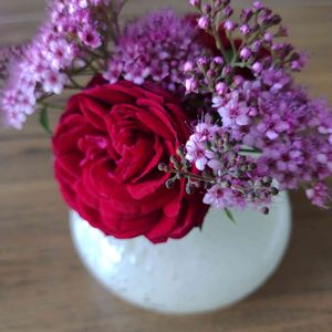 しもつけとミニバラ🌹 机の上をキレイにしたくなります🎵