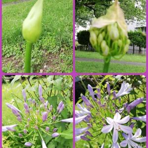 おはようございます☁️ アガパンサスです💜 蕾?からたくさんの蕾が出てきて咲く様子を撮りたくて4枚にまとめてみました💜 おもしろい花ですね💜