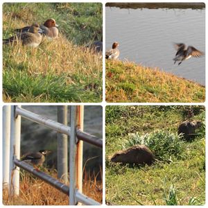 朝ウォーキング👟 上2枚 川の土手道に上がっていた鴨さん 近づくとサッ〜と川に飛びこんじゃった🦆 左下 ムクドリと教えていただきました 右下 ヌートリアは朝食中🌱🌿