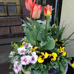 こんにちは👋😃 春ですね🎵🎶 外のお花が咲いてきました🎵 まるで、競って咲いているよう😆🎶 真ん中の虹色すみれは種から育てました✌️😄