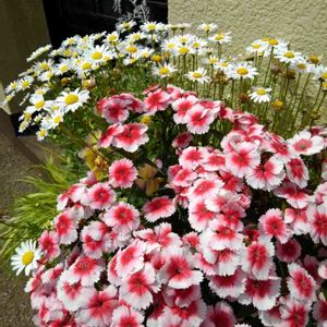 おはようございます😃 先月3月20日にpicした鉢のお花が自然に代わりました。プリムラ桜草と虹色すみれがなくなり、ノースポールと撫子がメインになっています😁😄🎵