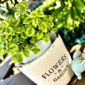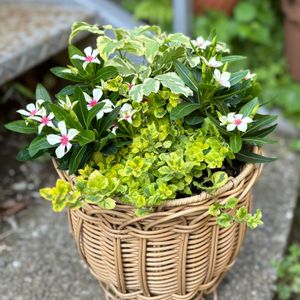 こんばんは😺 可愛いスタンドバスケット(水で洗える)を見つけたので寄せ植えしてみました✨ 涼しげなビンカ『フェアリーミントシリーズ』に合わせてリーフも選んでみました🤗🌿✨✨