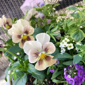 おはようございます。 一枚目、全部ビオラと思っていたけど……しかも、ハートの顔が揃わないと言う失敗してます。 2枚目、バコパが茂って、カバー鉢との隙間を隠す予定なんですけど、まだ時間かかりそう。 4枚目、寄せてる中の桜吹雪が、蕾が出来たけど、咲けるかな? 5枚目、地植えしている胡蝶の舞。実物はもう少し綺麗な色してます。もっと寒くなると、枯れますが、試しに植えてます。