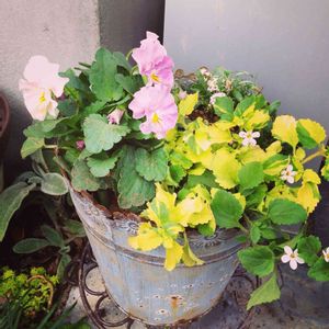 ビオラとガーデンシクラメンを使ったお花の寄せカゴを作りました。へデラを絡ませてナチュラルに✨ ブリキの鉢を器にしているので、このまま寄せ植えにしてもステキです😊 ギフトにおすすめのお花の寄せカゴ、ご予算に合わせてお作り致します。