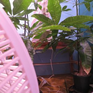 据え置き型の扇風機が強風すぎたので、別のところで使っていた壁掛けの扇風機を取り付けました。弱風でそよ風程度なので、パキラたちに優しいです。